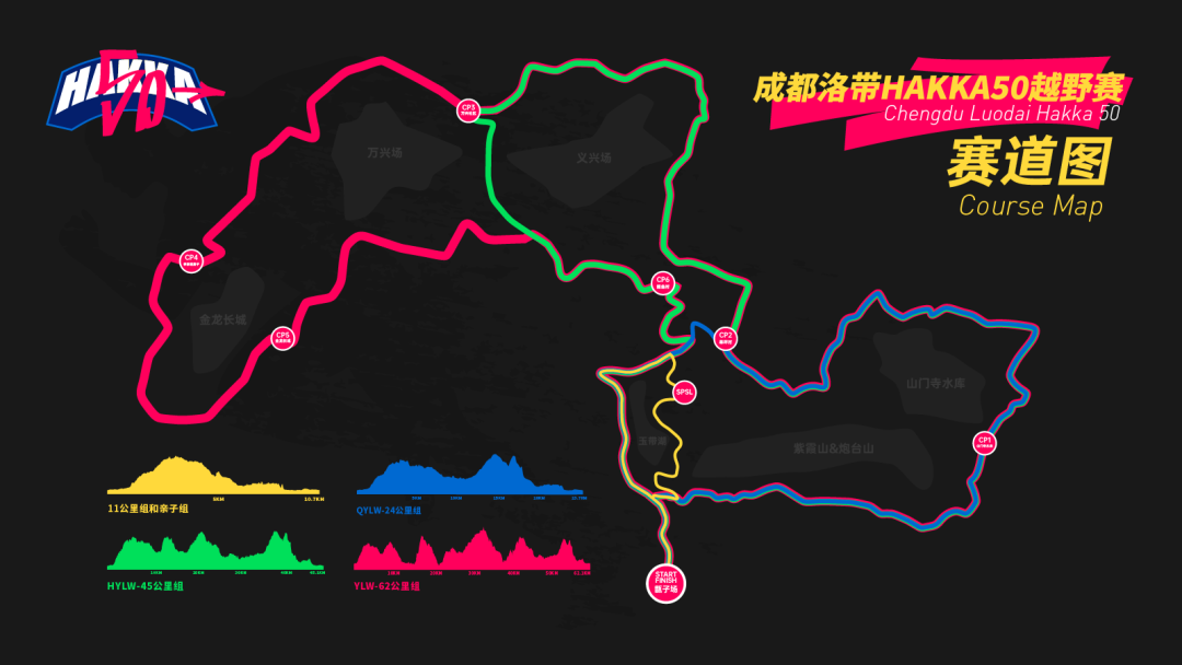 • YLW-62KM组:洛带甄子场(起点)→五里坡步道→李家沟水库→紫霞山→山门寺水库→红旗村→四方山→草坪村→义善桥→大兰村→702电台→万兴社区→新民村→李家老房子→石碾西路→金龙长城→白家斗→鲤鱼村→白碉堡→五里坡→洛带甄子场(终点)。