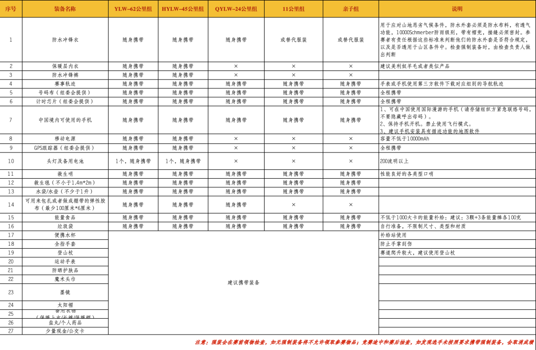 为了确保参赛者的安全和各组别赛事的良好进展,每个参赛者必须携带清单上的所有强制装备领取参赛包及物料,各个组别的强制装备说明如下。