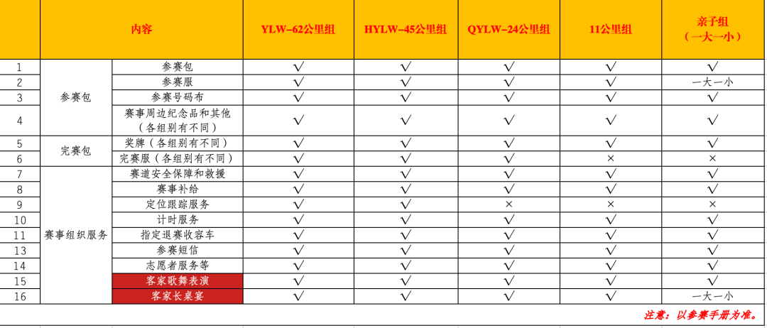 报名费包含如下服务,所有选手可以在赛后参加客家长桌宴,家属可以以¥60/人的价格购买长桌宴附加服务(如有需要,需在报名时一并购买附加服务)