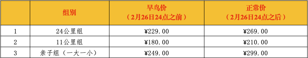 报名时间为2026年2月22日到2026年3月5日24点,其中早鸟价截止到2月26日24点,额满提前截止,各组别报名费用说明如下: