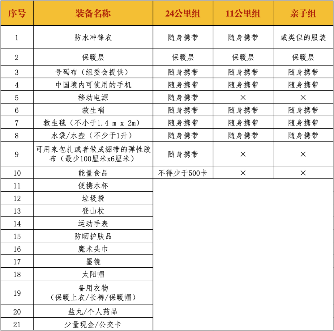 活动参与者必须全程携带强制装备,领包和检录时将进行检查,强制装备不完整者不得参加活动;组委会还将在各个补给点以及活动线路上不定点对活动参与者进行强制装备抽查,一旦发现强制装备不完整者立即要求退出活动。
