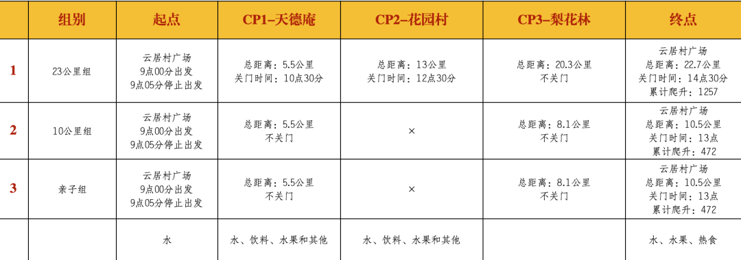 云居村广场(起点)→楠林路→云居院塔→天德庵→梨花林→云居村广场(终点),10.5公里,约472爬升,4个小时关门。