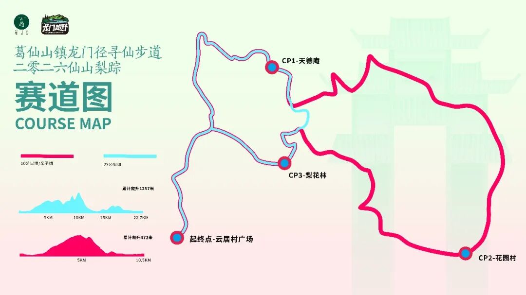 云居村广场(起点)→楠林路→云居院塔→天德庵→千年银杏王→云隐木竹→葛仙观→梨花林→云居村广场(终点),22.7公里,约1257米爬升,5.5个小时关门,预估ITRA积分1分