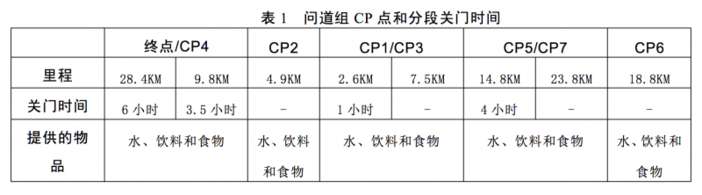 6、CP点和分段关门时间:问道组共设置7个CP点,各个CP点的位置、提供的物品以及关门时间如表1所示: