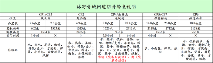 组委会将继续在各个补给点为选手提供水、热水、饮料、姜汤、粥/麦片、小面包等补给品,并且还在终点为选手提供包括抄手、醪糟粉子、酸辣粉、手工精酿啤酒和肉类等免费食品,更新后的问道组和寻幽组的补给点说明以及关门时间如下: