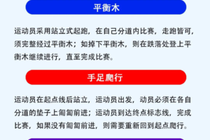 竞赛项目:本次赛事拟定双脚跳栏架、绕杆跑、平衡木、手足爬行、手拉轮胎、10米冲刺跑共计6个项目。