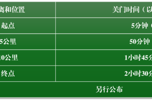 为了保证参赛运动员比赛安全、顺利,比赛期间比赛路线各段设关门时间,起跑至关门时间到后,参赛者在规定的关门时间内未跑完对应距离的参赛者须立即停止比赛,退出赛道,以免发生危险。退出比赛者可乘坐组委会提供的摆渡车到相应项目的终点。