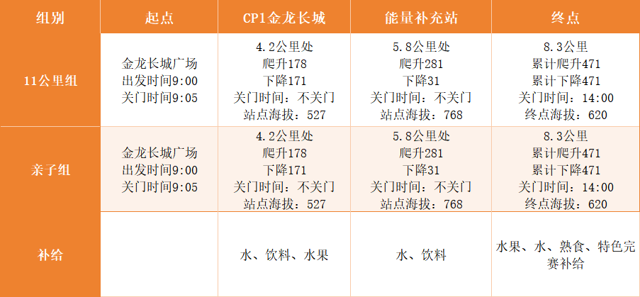 金龙长城广场(起点)→樱花路→金龙长城→金龙寺路-金龙长城后山→金龙湖→红房子→金龙长城广场(终点);赛道全长10.7公里,累计爬升561米,关门时间4小时。