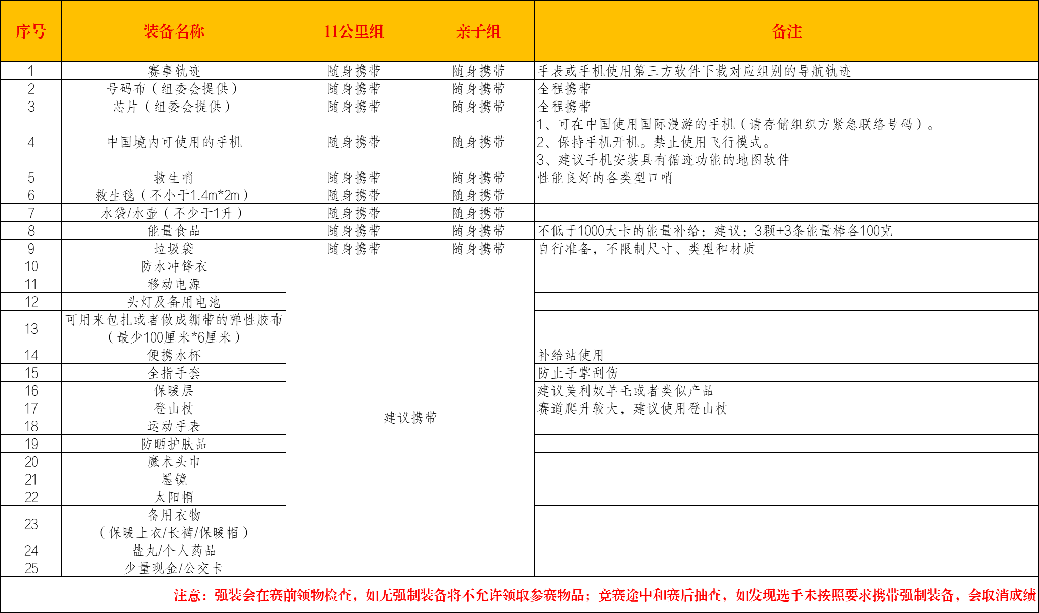 赛事参与者必须全程携带强制装备,领包和检录时将进行检查,强制装备不完整者不得参加活动;组委会还将在各个补给点以及活动线路上不定点对活动参与者进行强制装备抽查,一旦发现强制装备不完整者立即要求退出比赛。