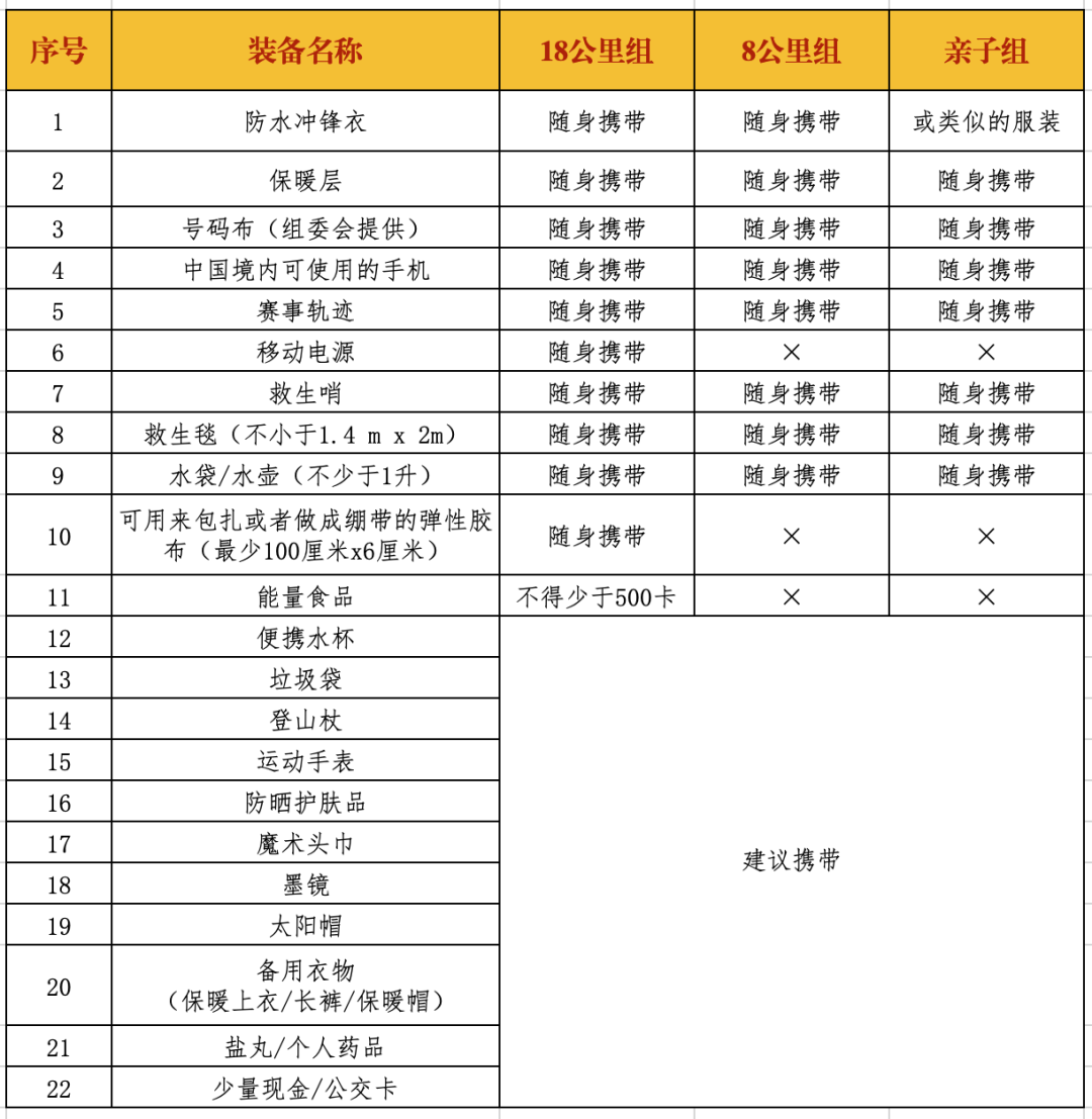 活动参与者必须全程携带强制装备,领包和检录时将进行检查,强制装备不完整者不得参加活动;组委会还将在各个补给点以及活动线路上不定点对活动参与者进行强制装备抽查,一旦发现强制装备不完整者立即要求退出活动。