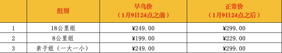 报名时间为2026年1月7日到2026年1月15日24点,其中早鸟价截止到1月9日24点,额满提前截止,各组别报名费用说明如下: