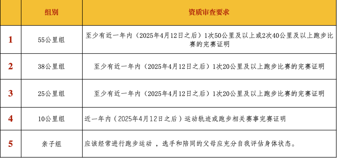 参加55公里组、38公里组、25公里组的参赛选手(10公里组和亲子组不需要)须提交赛前1年内(2025年4月12日之后)的在正规医疗机构(二级甲等及以上的医院)的体检报告(必检项目为血压检测和心电图报告)。体检报告在赛前领物时现场提交纸质版(可用电子报告打印),具体提交流程参考后续公众号通知。