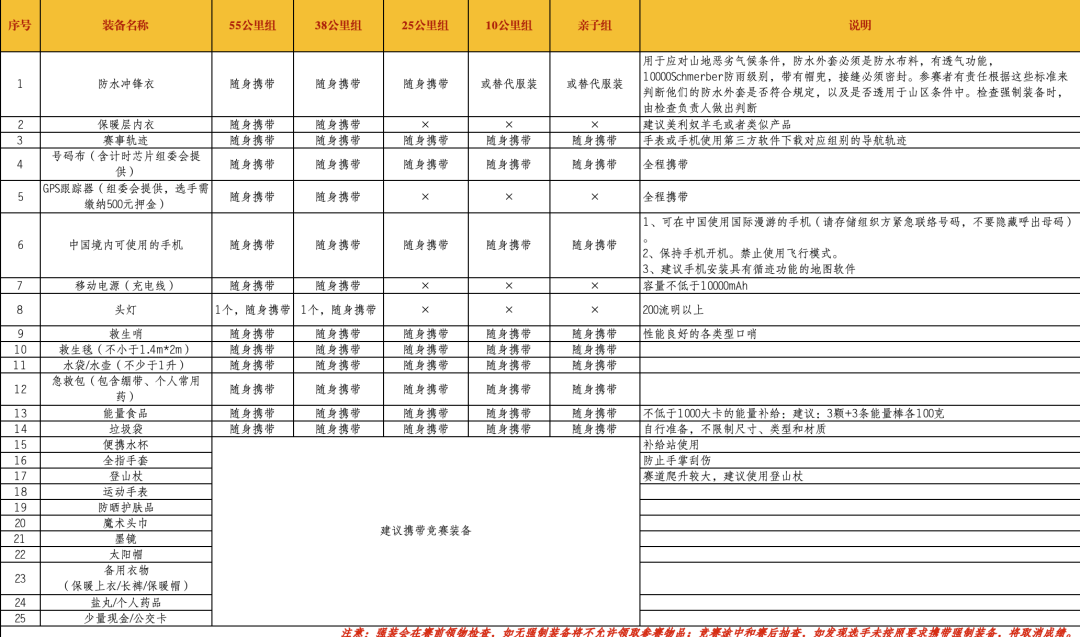 本着安全性和公平性的原则,本次赛事每位参赛者必须携带清单上的所有竞赛装备(强制装备)报到领物、赛前检录、赛中检查和完赛检查,竞赛装备分为个人竞赛装备(强制装备)以及建议竞赛装备,而个人竞赛装备(强制装备)分为组委会统一提供的竞赛装备以及参赛选手自行携带的个人竞赛装备(强制装备),各个组别的竞赛装备(强制装备)说明如下: