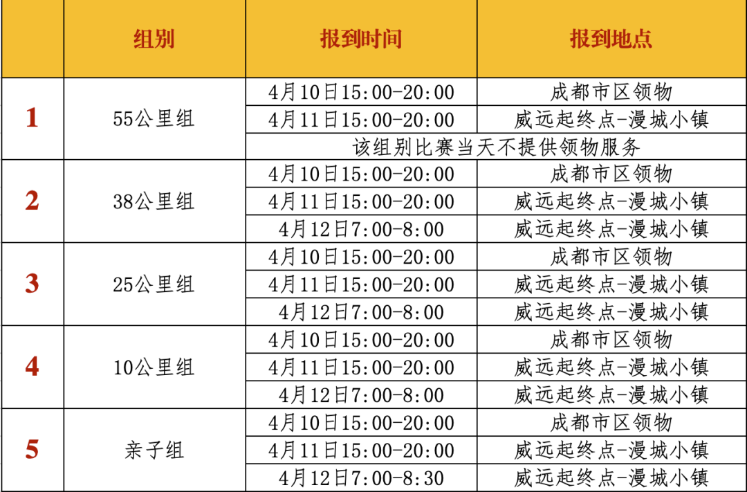 根据各赛道组别起跑时间以及相关要求,同时也为确保参赛选手有足够适应时间,本赛事要求各组别报到领物截止时间如下(如无特殊情况申请,比赛当天逾期前来报到领物者,将取消参赛资格),必须由参赛者本人亲自领取参赛物品,不接受代领,具体领取地点,请关注官方公众号后续通知。