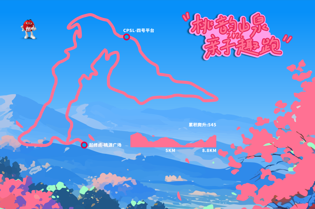 桃花故里桃源广场(起点)→青杠坡→四号平台→情道→桃花故里桃源广场(终点),总距离约8.8公里,545米爬升,4个小时关门。