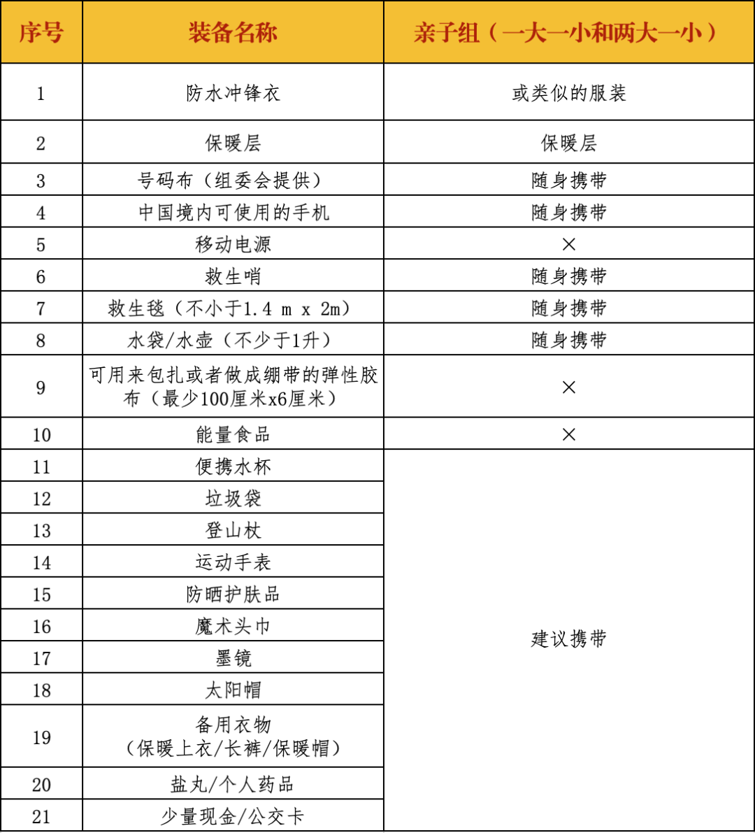 活动参与者必须全程携带强制装备,领包和检录时将进行检查,强制装备不完整者不得参加活动;组委会还将在各个补给点以及活动线路上不定点对活动参与者进行强制装备抽查,一旦发现强制装备不完整者立即要求退出活动。