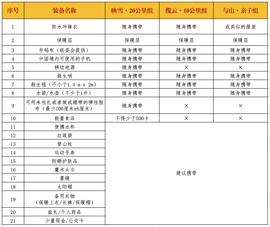 活动参与者必须全程携带强制装备,领包和检录时将进行检查,强制装备不完整者不得参加活动;组委会还将在各个补给点以及活动线路上不定点对活动参与者进行强制装备抽查,一旦发现强制装备不完整者立即要求退出活动。并且保留对缺少强制装备者取消成绩的权利